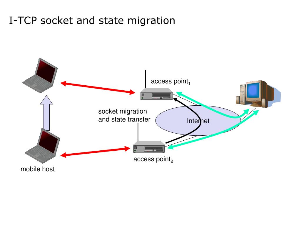 I-TCP socket and state migration access point1 socket migration and state transfer Internet access point2 mobile host