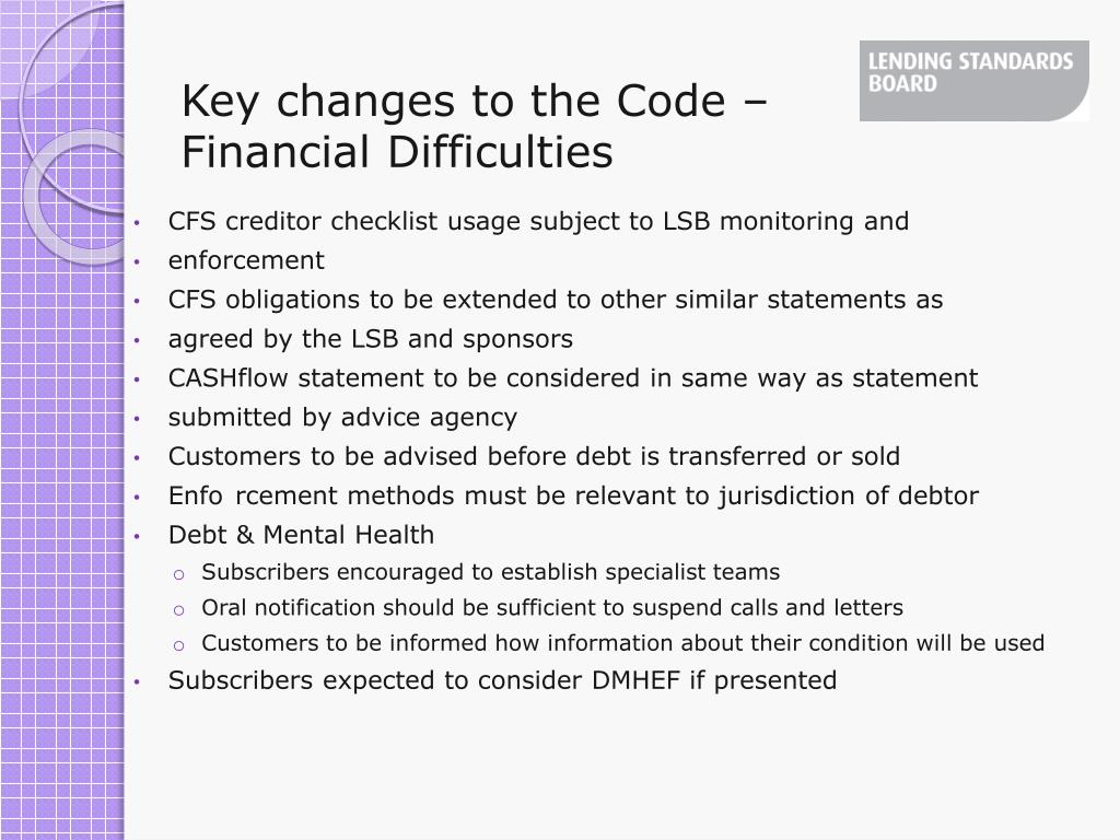 Key changes to the Code – Financial Difficulties • CFS creditor checklist usage subject to LSB monitoring and • enforcement • CFS obligations to be extended to other similar statements as • agreed by the LSB and sponsors • CASHflow statement to be considered in same way as statement • submitted by advice agency • Customers to be advised before debt is transferred or sold • Enforcement methods must be relevant to jurisdiction of debtor • Debt & Mental Health • Subscribers encouraged to establish specialist teams • Oral notification should be sufficient to suspend calls and letters • Customers to be informed how information about their condition will be used • Subscribers expected to consider DMHEF if presented