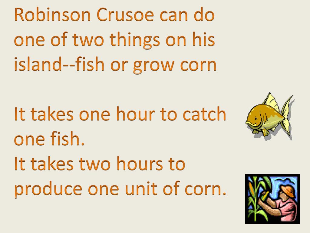 Robinson Crusoe Economies. Robinson Crusoe can do one of two things on his island--fish or grow corn It takes one hour to catch one fish. It takes two hours to produce one unit of corn. Robinson Crusoe Economy. 24 22 20 18 16 14 12 10 8 6 4.