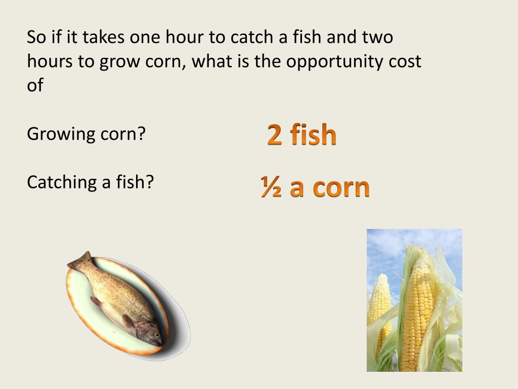 So if it takes one hour to catch a fish and two hours to grow corn, what is the opportunity cost of Growing corn? Catching a fish? 2 fish ½ a corn