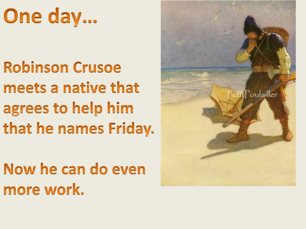 One day… Robinson Crusoe meets a native that agrees to help him that he names Friday. Now he can do even more work.