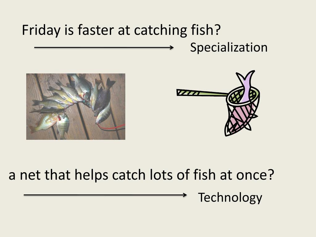 Friday is faster at catching fish? Specialization a net that helps catch lots of fish at once? Technology