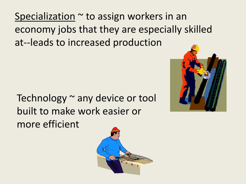 Specialization ~ to assign workers in an economy jobs that they are especially skilled at--leads to increased production Technology ~ any device or tool built to make work easier or more efficient