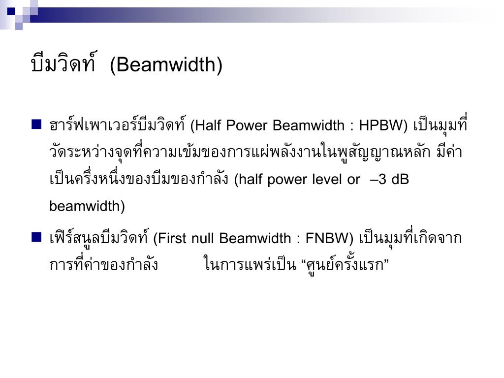 บีมวิดท์ (Beamwidth) • ฮาร์ฟเพาเวอร์บีมวิดท์ (Half Power Beamwidth : HPBW) เป็นมุมที่วัดระหว่างจุดที่ความเข้มของการแผ่พลังงานในพูสัญญาณหลัก มีค่าเป็นครึ่งหนึ่งของบีมของกำลัง (half power level or–3 dB beamwidth) • เฟิร์สนูลบีมวิดท์ (First null Beamwidth : FNBW) เป็นมุมที่เกิดจากการที่ค่าของกำลัง ในการแพร่เป็น “ศูนย์ครั้งแรก”