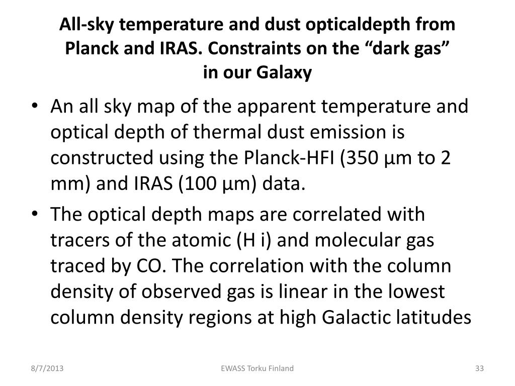 All-sky temperature and dust opticaldepthfrom Planck and IRAS. Constraints on the “dark gas”in our Galaxy • An all sky map of the apparent temperature and optical depth of thermal dust emission is constructed using the Planck-HFI (350 μm to 2 mm) and IRAS (100 μm) data. • The optical depth maps are correlated with tracers of the atomic (H i) and molecular gas traced by CO. The correlation with the column density of observed gas is linear in the lowest column density regions at high Galactic latitudes EWASS Torku Finland