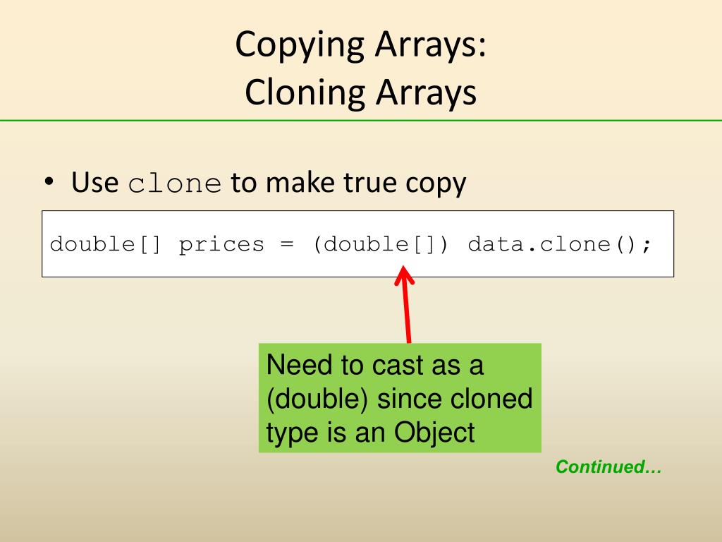 Copying Arrays: Cloning Arrays • Use clone to make true copy double[] prices = (double[]) data.clone(); Need to cast as a (double) since cloned type is an Object Continued…