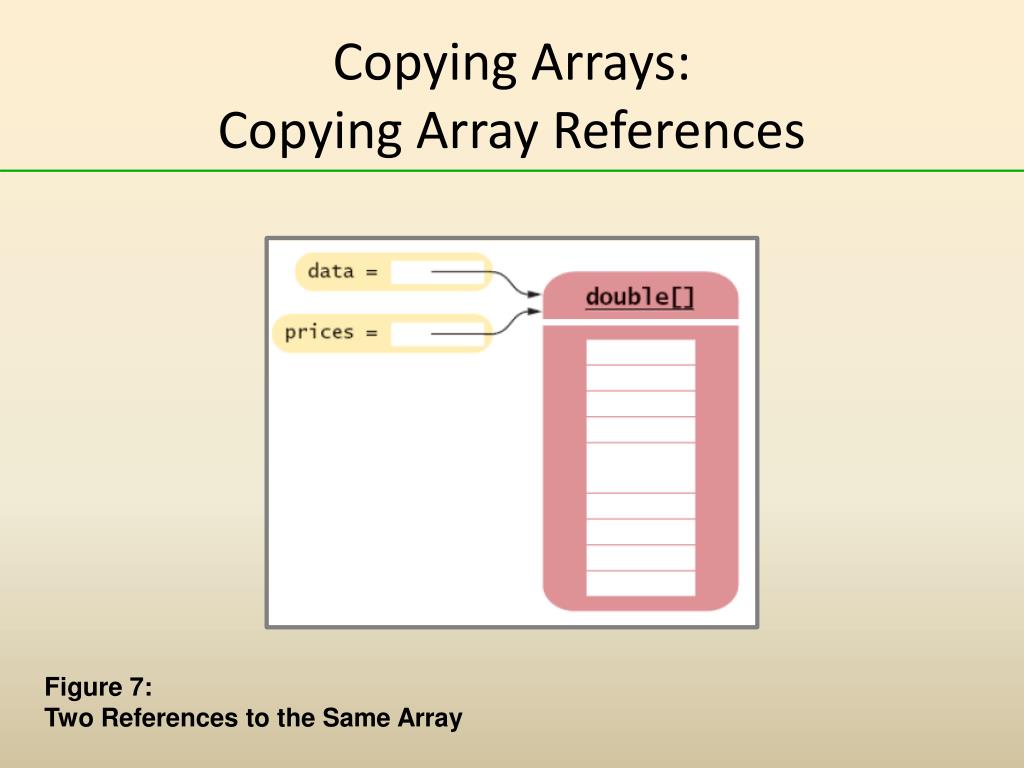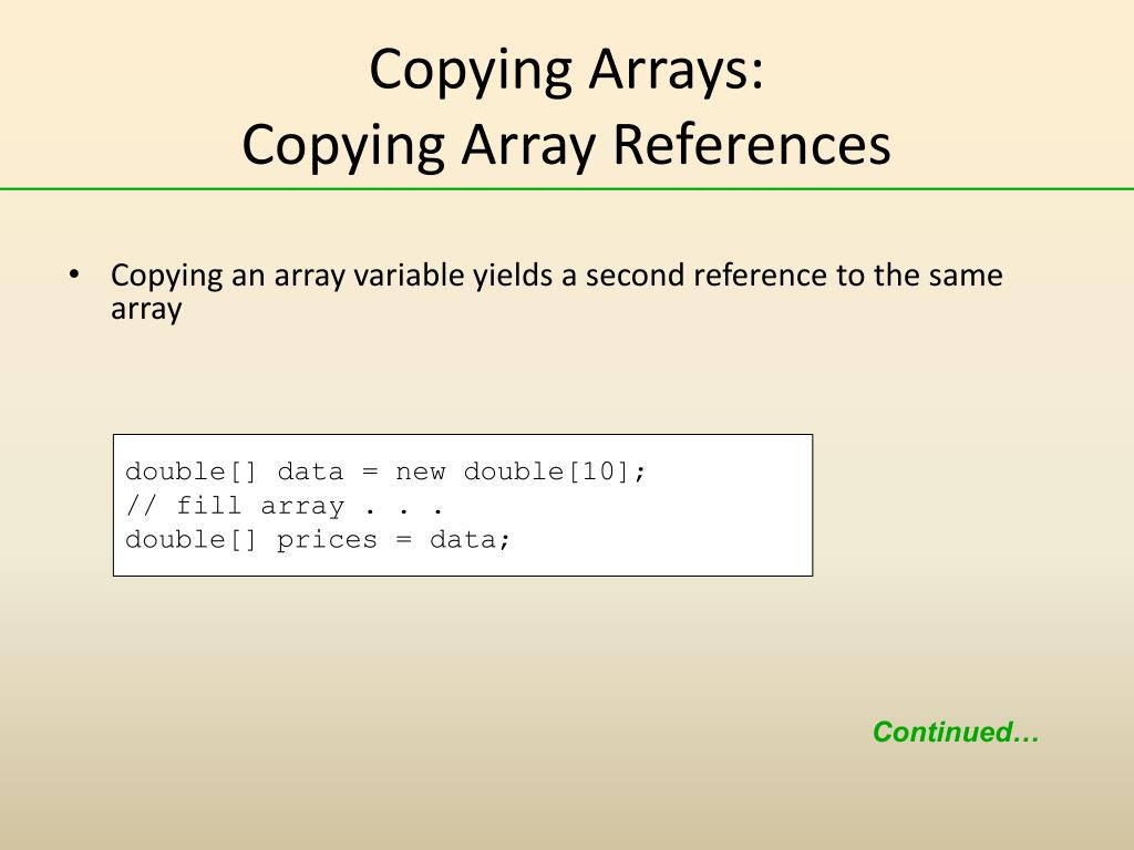 Copying Arrays: Copying Array References • Copying an array variable yields a second reference to the same array double[] data = new double[10];// fill array . . .double[] prices = data; Continued…