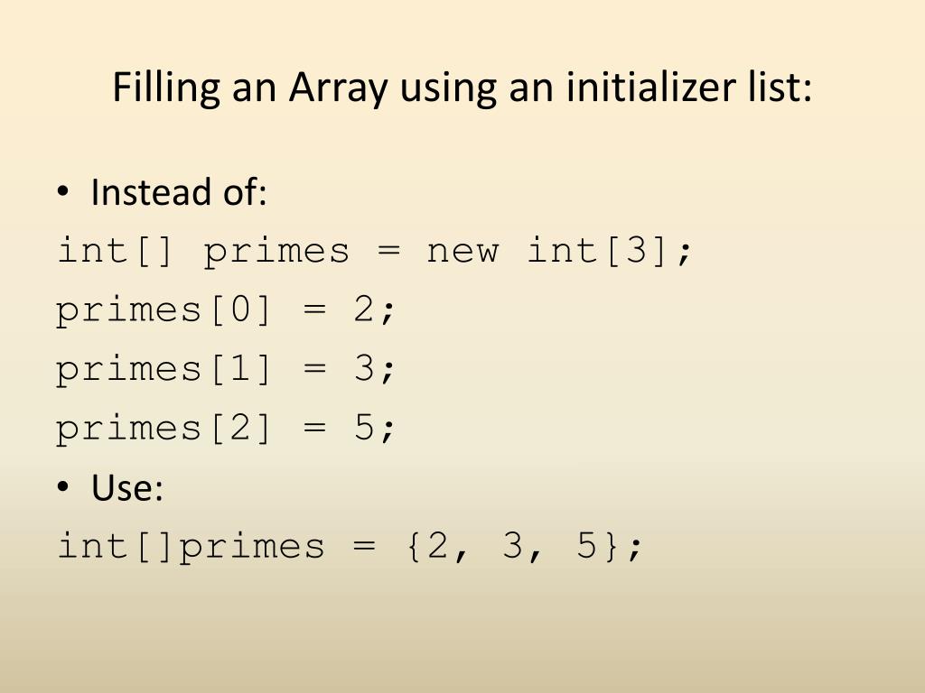 Filling an Array using an initializer list: • Instead of: int[] primes = new int[3]; primes[0] = 2; primes[1] = 3; primes[2] = 5; • Use: int[]primes = {2, 3, 5};