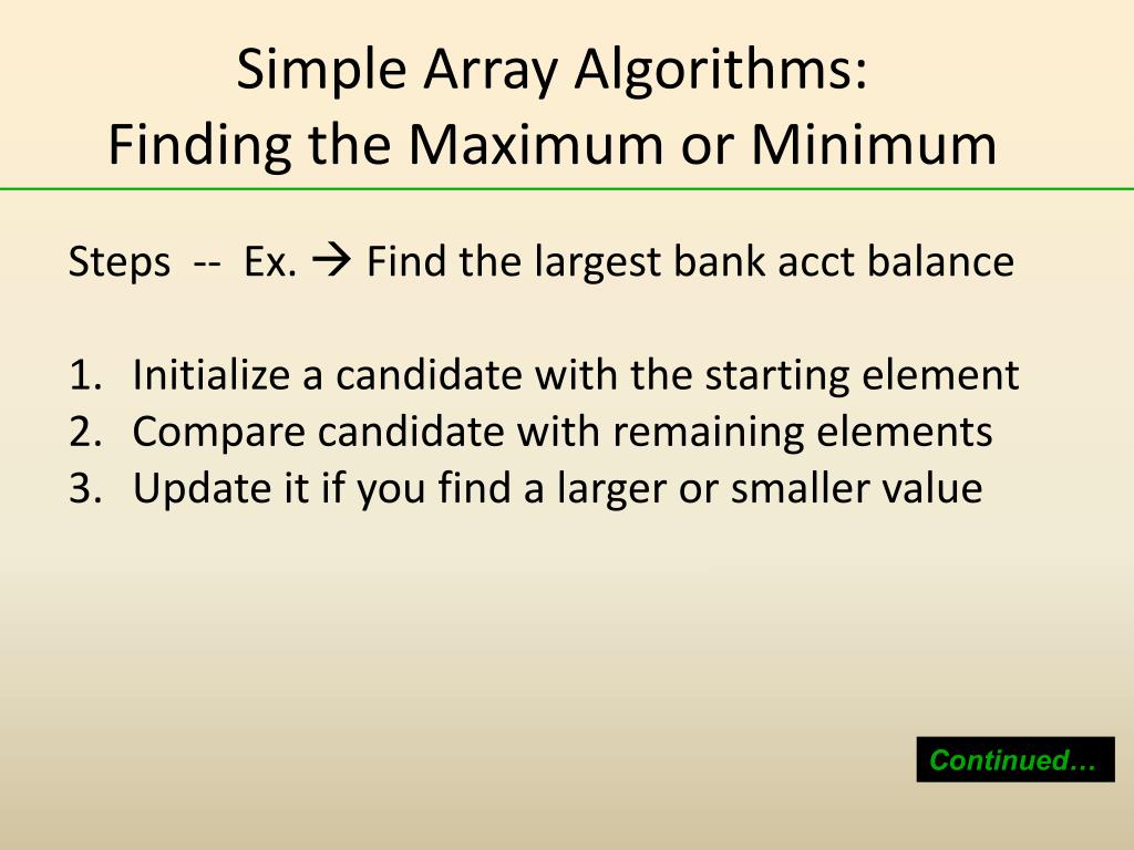 Simple Array Algorithms: Finding the Maximum or Minimum Steps -- Ex. Find the largest bank acct balance • Initialize a candidate with the starting element • Compare candidate with remaining elements • Update it if you find a larger or smaller value Continued…