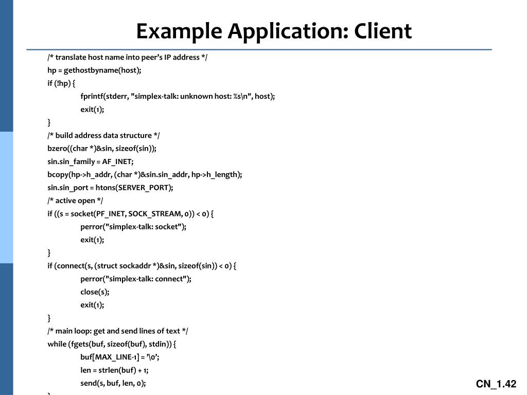 Example Application: Client /* translate host name into peer’s IP address */ hp = gethostbyname(host); if (!hp) { fprintf(stderr, "simplex-talk: unknown host: %s\n", host); exit(1); } /* build address data structure */ bzero((char *)&sin, sizeof(sin)); sin.sin_family = AF_INET; bcopy(hp->h_addr, (char *)&sin.sin_addr, hp->h_length); sin.sin_port = htons(SERVER_PORT); /* active open */ if ((s = socket(PF_INET, SOCK_STREAM, 0)) < 0) { perror("simplex-talk: socket"); exit(1); } if (connect(s, (structsockaddr *)&sin, sizeof(sin)) < 0) { perror("simplex-talk: connect"); close(s); exit(1); } /* main loop: get and send lines of text */ while (fgets(buf, sizeof(buf), stdin)) { buf[MAX_LINE-1] = ’\0’; len = strlen(buf) + 1; send(s, buf, len, 0); } }