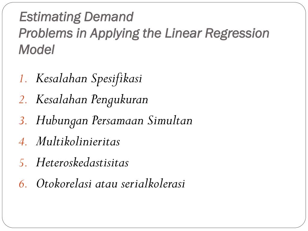 Estimating DemandProblems in Applying the Linear Regression Model • Kesalahan Spesifikasi • Kesalahan Pengukuran • Hubungan Persamaan Simultan • Multikolinieritas • Heteroskedastisitas • Otokorelasi atau serialkolerasi