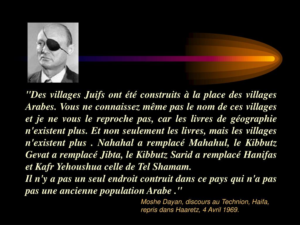 13. "Des villages Juifs ont été construits à la place des villages Arabes. Vous ne connaissez même pas le nom de ces villages et je ne vous le reproche pas, car les livres de géographie n'existent plus. Et non seulement les livres, mais les villages n'existent plus . Nahahal a remplacé Mahahul, le Kibbutz Gevat a remplacé Jibta, le Kibbutz Sarid a remplacé Hanifas et Kafr Yehoushua celle de Tel Shamam. Il n'y a pas un seul endroit contruit dans ce pays qui n'a pas pas une ancienne population Arabe ." Moshe Dayan, discours au Technion, Haifa, repris dans Haaretz, 4 Avril 1969.