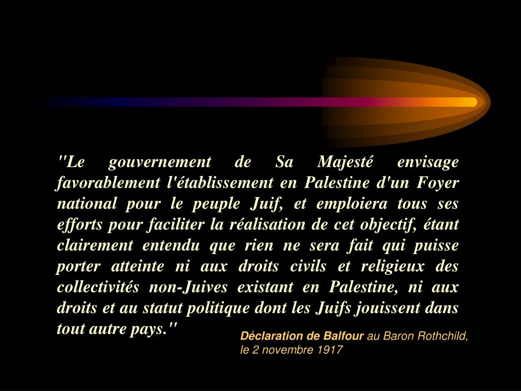 2. "Le gouvernement de Sa Majesté envisage favorablement l'établissement en Palestine d'un Foyer national pour le peuple Juif, et emploiera tous ses efforts pour faciliter la réalisation de cet objectif, étant clairement entendu que rien ne sera fait qui puisse porter atteinte ni aux droits civils et religieux des collectivités non-Juives existant en Palestine, ni aux droits et au statut politique dont les Juifs jouissent dans tout autre pays." Déclaration de Balfour au Baron Rothchild, le 2 novembre 1917