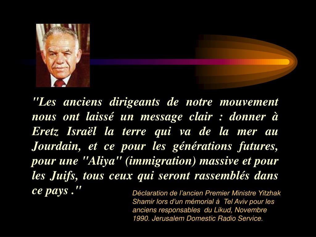 3. "Les anciens dirigeants de notre mouvement nous ont laissé un message clair : donner à Eretz Israël la terre qui va de la mer au Jourdain, et ce pour les générations futures, pour une "Aliya" (immigration) massive et pour les Juifs, tous ceux qui seront rassemblés dans ce pays ." Déclaration de l’ancien Premier Ministre Yitzhak Shamir lors d’un mémorial à Tel Aviv pour les anciens responsables du Likud, Novembre 1990. Jerusalem Domestic Radio Service.