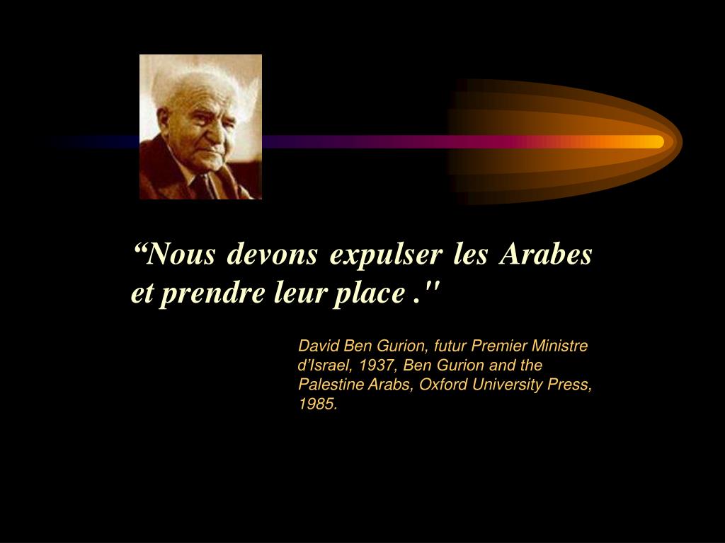 4. “Nous devons expulser les Arabes et prendre leur place ." David Ben Gurion, futur Premier Ministre d’Israel, 1937, Ben Gurion and the Palestine Arabs, Oxford University Press, 1985.