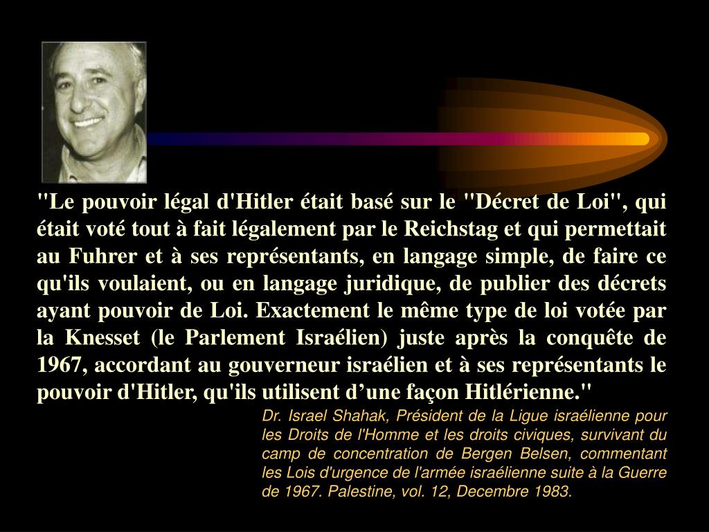 44. "Le pouvoir légal d'Hitler était basé sur le "Décret de Loi", qui était voté tout à fait légalement par le Reichstag et qui permettait au Fuhrer et à ses représentants, en langage simple, de faire ce qu'ils voulaient, ou en langage juridique, de publier des décrets ayant pouvoir de Loi. Exactement le même type de loi votée par la Knesset (le Parlement Israélien) juste après la conquête de 1967, accordant au gouverneur israélien et à ses représentants le pouvoir d'Hitler, qu'ils utilisent d’une façon Hitlérienne." Dr. Israel Shahak, Président de la Ligue israélienne pour les Droits de l'Homme et les droits civiques, survivant du camp de concentration de Bergen Belsen, commentant les Lois d'urgence de l'armée israélienne suite à la Guerre de 1967. Palestine, vol. 12, Decembre 1983.