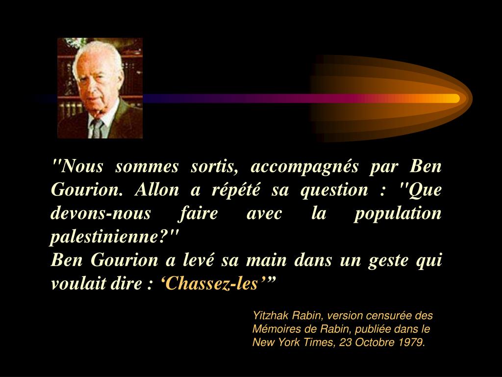 7. "Nous sommes sortis, accompagnés par Ben Gourion. Allon a répété sa question : "Que devons-nous faire avec la population palestinienne?" Ben Gourion a levé sa main dans un geste qui voulait dire : ‘Chassez-les’” Yitzhak Rabin, version censurée des Mémoires de Rabin, publiée dans le New York Times, 23 Octobre 1979.