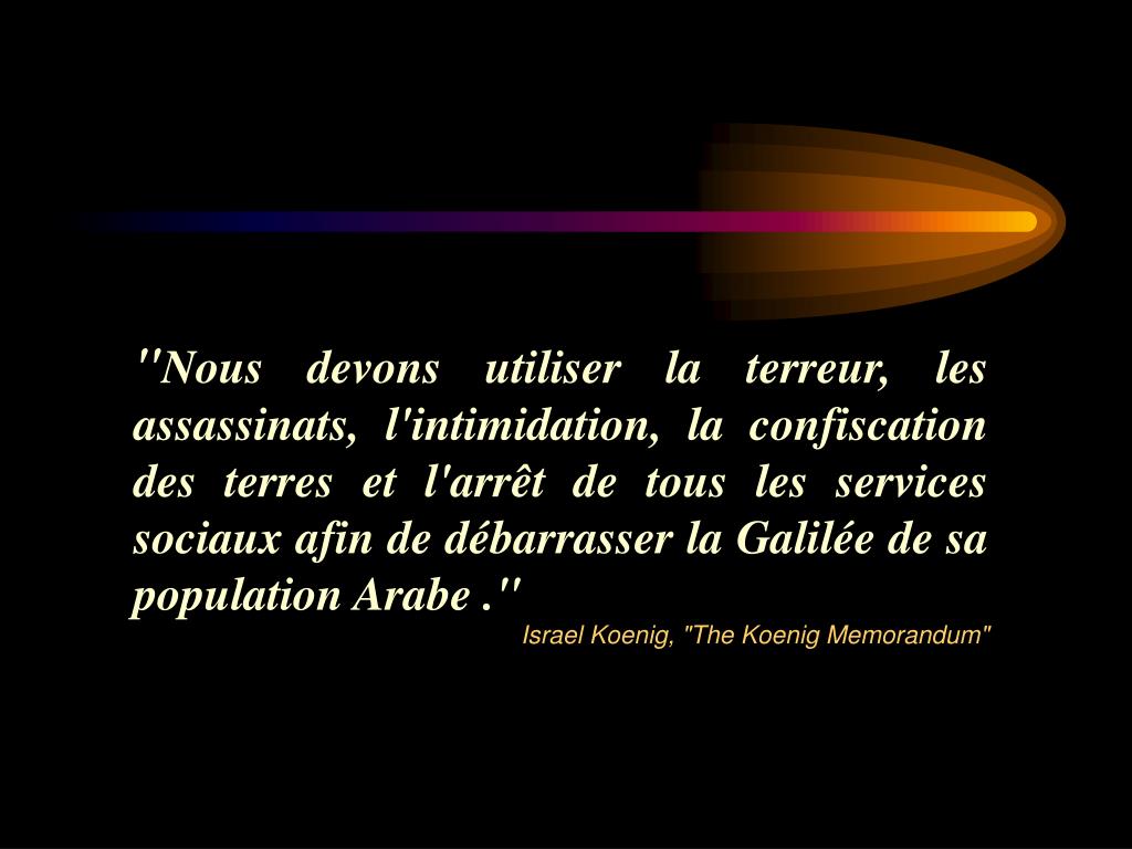 8. "Nous devons utiliser la terreur, les assassinats, l'intimidation, la confiscation des terres et l'arrêt de tous les services sociaux afin de débarrasser la Galilée de sa population Arabe ." Israel Koenig, "The Koenig Memorandum"