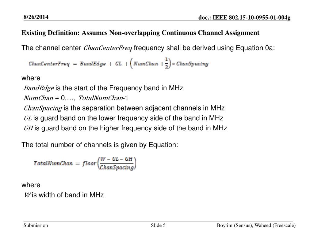 Existing Definition: Assumes Non-overlapping Continuous Channel Assignment The channel center ChanCenterFreq frequency shall be derived using Equation 0a: where BandEdge is the start of the Frequency band in MHz NumChan = 0,…, TotalNumChan-1 ChanSpacing is the separation between adjacent channels in MHz GL is guard band on the lower frequency side of the band in MHz GH is guard band on the higher frequency side of the band in MHzThe total number of channels is given by Equation: where W is width of band in MHz Boytim (Sensus), Waheed (Freescale)