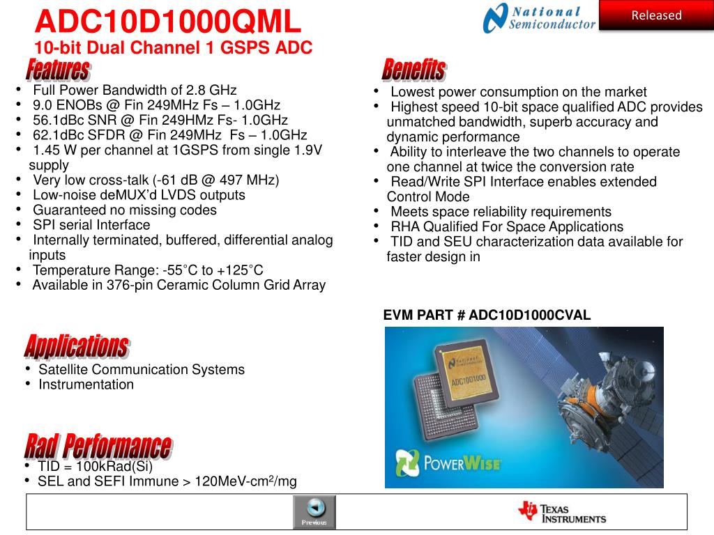 ADC10D1000QML10-bit Dual Channel 1 GSPS ADC Released Features Benefits • Full Power Bandwidth of 2.8 GHz • 9.0 ENOBs @ Fin 249MHz Fs – 1.0GHz • 56.1dBc SNR @ Fin 249HMz Fs- 1.0GHz • 62.1dBc SFDR @ Fin 249MHz Fs – 1.0GHz • 1.45 W per channel at 1GSPS from single 1.9V supply • Very low cross-talk (-61 dB @ 497 MHz) • Low-noise deMUX’d LVDS outputs • Guaranteed no missing codes • SPI serial Interface • Internally terminated, buffered, differential analog inputs • Temperature Range: -55°C to +125°C • Available in 376-pin Ceramic Column Grid Array • Lowest power consumption on the market • Highest speed 10-bit space qualified ADC provides unmatched bandwidth, superb accuracy and dynamic performance • Ability to interleave the two channels to operate one channel at twice the conversion rate • Read/Write SPI Interface enables extended Control Mode • Meets space reliability requirements • RHA Qualified For Space Applications • TID and SEU characterization data available for faster design in EVM PART # ADC10D1000CVAL Applications • Satellite Communication Systems • Instrumentation Rad Performance • TID = 100kRad(Si) • SEL and SEFI Immune > 120MeV-cm2/mg