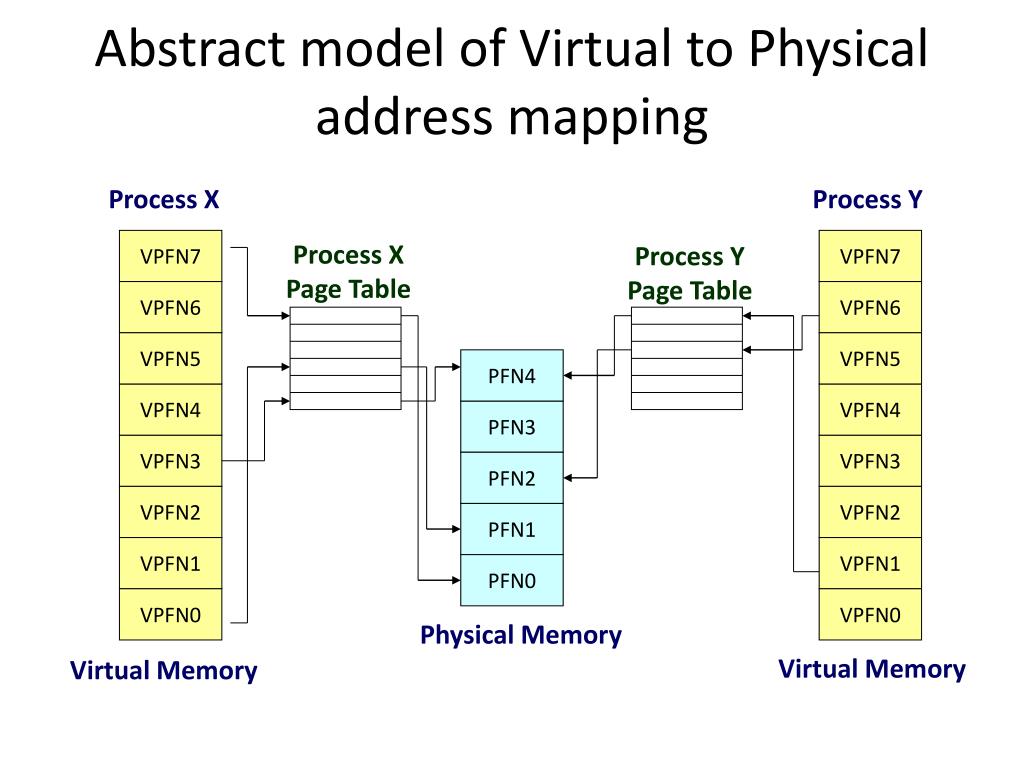 VPFN7 VPFN6 VPFN7 VPFN5 VPFN6 VPFN4 VPFN5 VPFN3 VPFN4 PFN4 VPFN2 VPFN3 PFN3 VPFN1 VPFN2 PFN2 VPFN0 VPFN1 PFN1 VPFN0 PFN0 Abstract model of Virtual to Physical address mapping Process X Process Y Process X Page Table Process Y Page Table Physical Memory Virtual Memory Virtual Memory