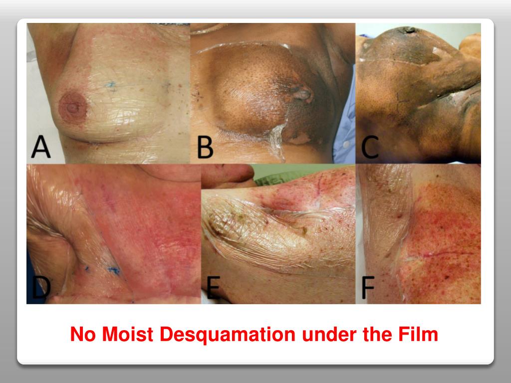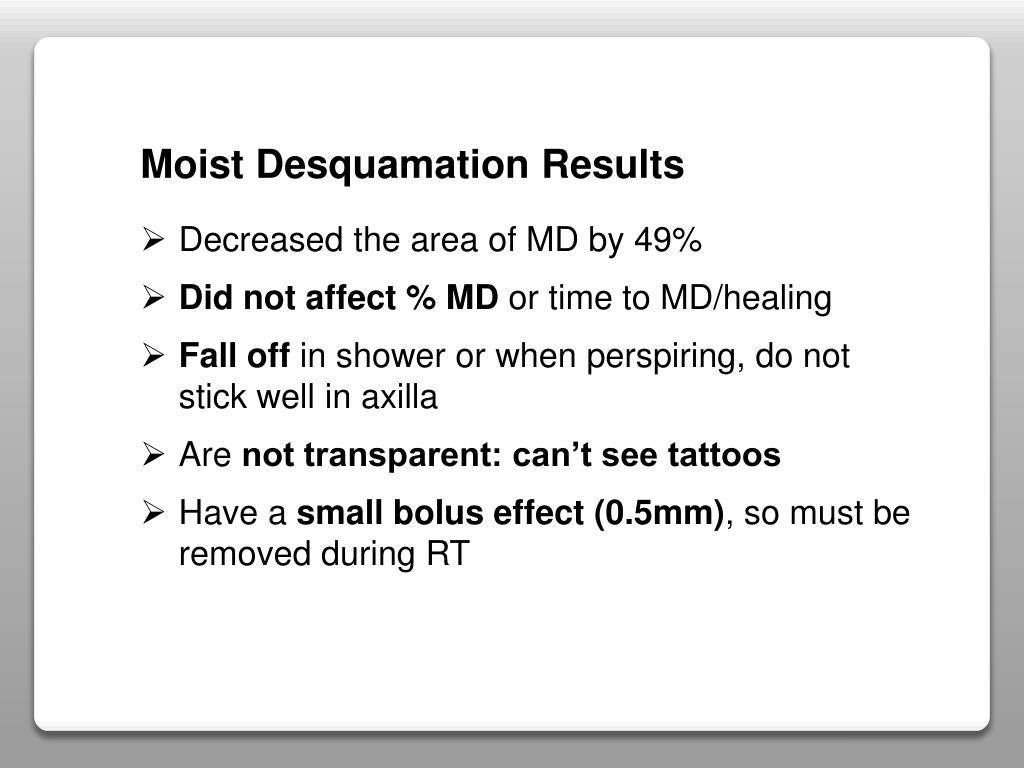 Moist Desquamation Results • Decreased the area of MD by 49% • Did not affect % MD or time to MD/healing • Fall off in shower or when perspiring, do not stick well in axilla • Are not transparent: can’t see tattoos • Have a small bolus effect (0.5mm), so must be removed during RT