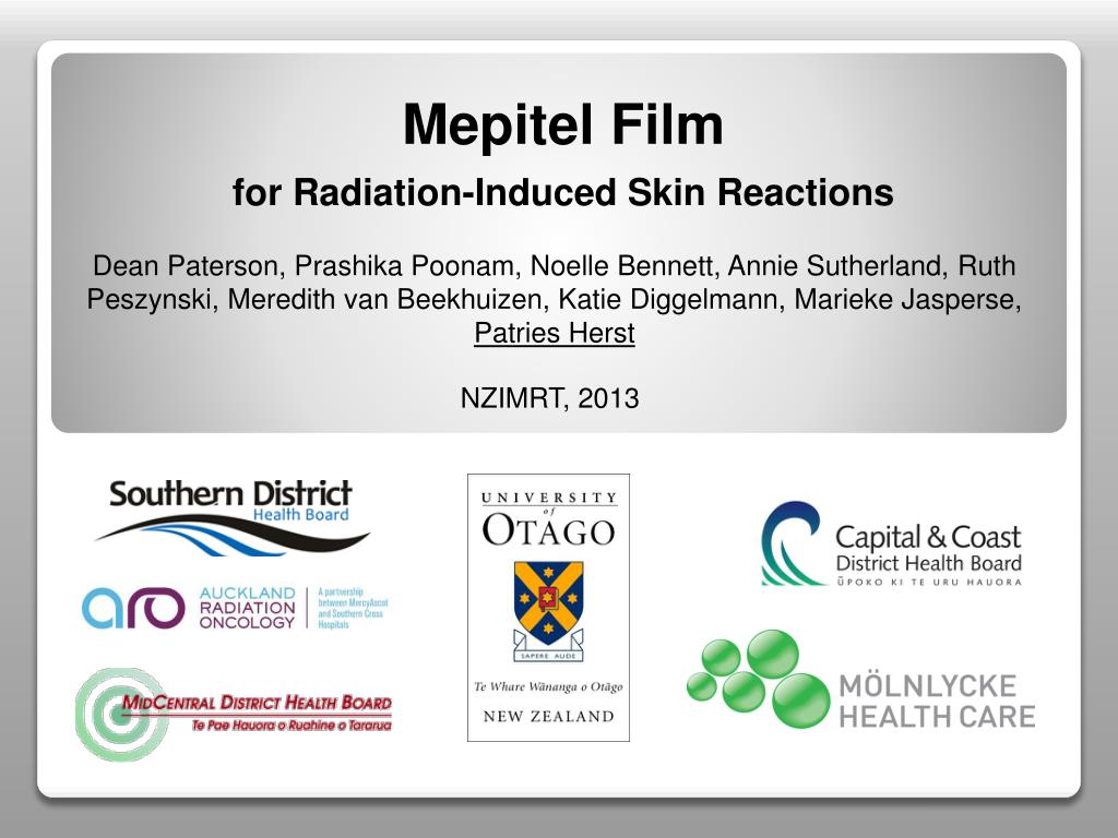 Mepitel Film for Radiation-Induced Skin Reactions Dean Paterson, Prashika Poonam, Noelle Bennett, Annie Sutherland, Ruth Peszynski, Meredith van Beekhuizen, Katie Diggelmann, Marieke Jasperse, Patries Herst NZIMRT, 2013