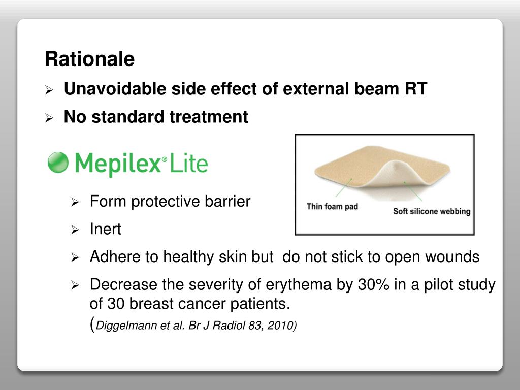 Rationale • Unavoidable side effect of external beam RT • No standard treatment • Form protective barrier • Inert • Adhere to healthy skin but do not stick to open wounds • Decrease the severity of erythema by 30% in a pilot study of 30 breast cancer patients. • (Diggelmann et al. Br J Radiol 83, 2010)