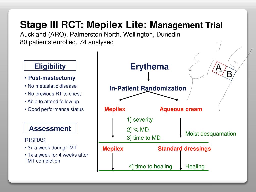Erythema Eligibility • Post-mastectomy • No metastatic disease • No previous RT to chest • Able to attend follow up • Good performance status In-Patient Randomization Mepilex Aqueous cream 2] % MD 3] time to MD Moist desquamation Assessment Standard dressings Mepilex RISRAS • 3x a week during TMT • 1x a week for 4 weeks after TMT completion 4] time to healing Healing Stage III RCT: Mepilex Lite: Management Trial Auckland (ARO), Palmerston North, Wellington, Dunedin 80 patients enrolled, 74 analysed 1] severity
