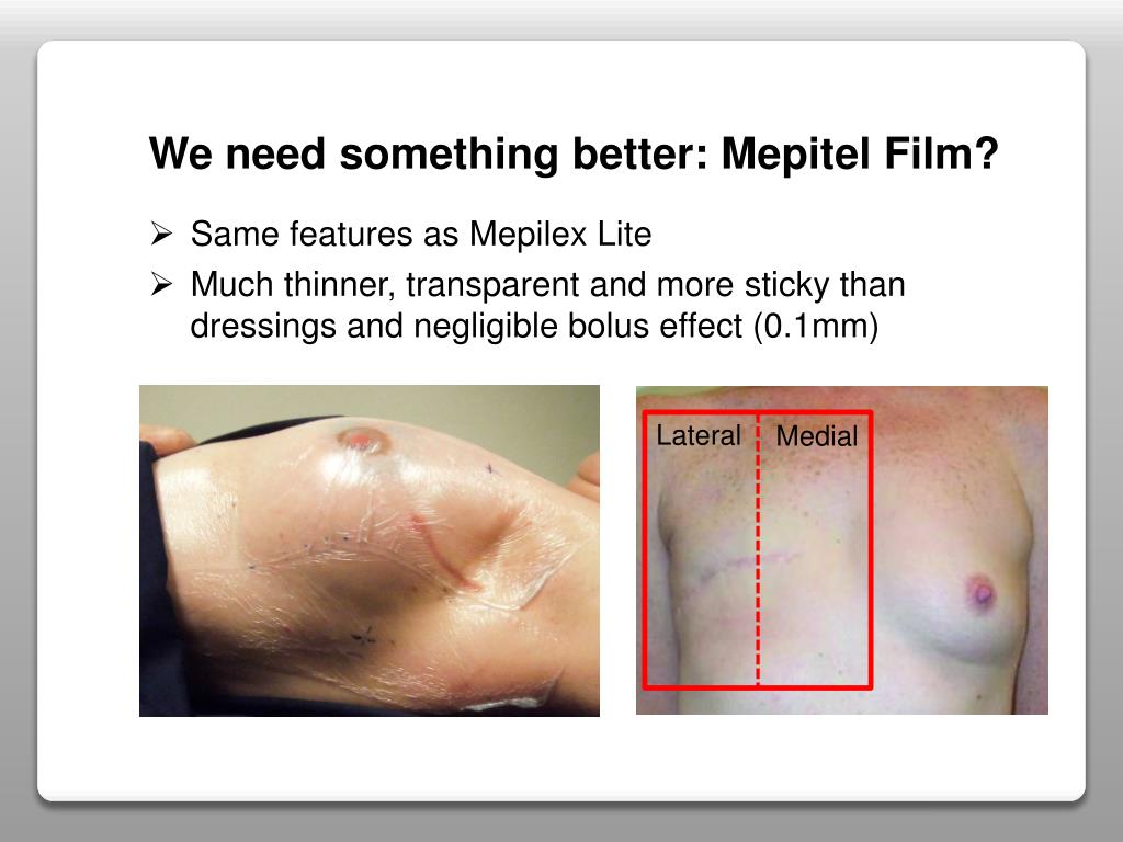 We need something better: Mepitel Film? • Same features as MepilexLite • Much thinner, transparent and more sticky than dressings and negligible bolus effect (0.1mm) Lateral Medial