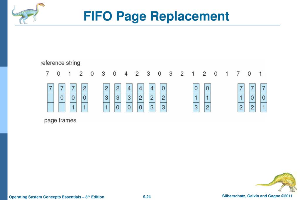 Page and Frame Replacement Algorithms • Frame-allocation algorithm determines • How many frames to give each process • Which frames to replace • Page-replacement algorithm • Want lowest page-fault rate on both first access and re-access • Evaluate algorithm by running it on a particular string of memory references (reference string) and computing the number of page faults on that string • String is just page numbers, not full addresses • Repeated access to the same page does not cause a page fault • In all our examples, the reference string is 7,0,1,2,0,3,0,4,2,3,0,3,0,3,2,1,2,0,1,7,0,1