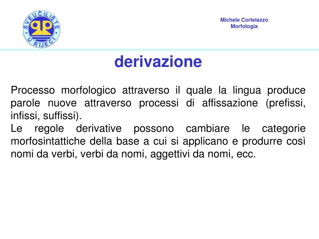 derivazione Processo morfologico attraverso il quale la lingua produce parole nuove attraverso processi di affissazione (prefissi, infissi, suffissi). Le regole derivative possono cambiare le categorie morfosintattiche della base a cui si applicano e produrre così nomi da verbi, verbi da nomi, aggettivi da nomi, ecc.