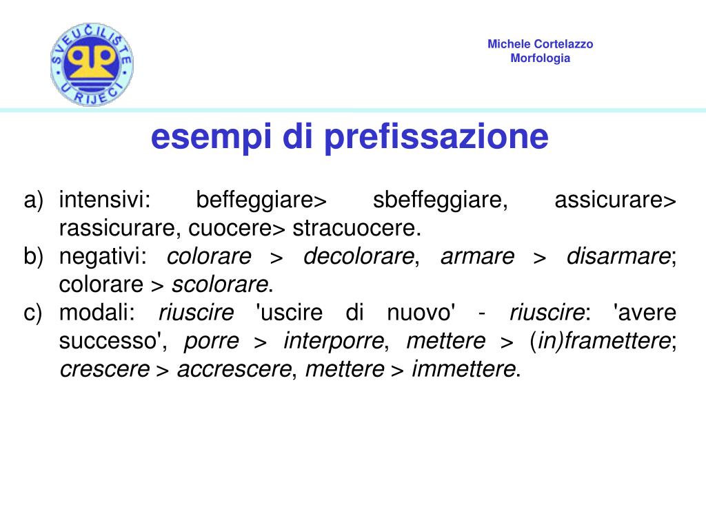 esempi di prefissazione • intensivi: beffeggiare> sbeffeggiare, assicurare> rassicurare, cuocere> stracuocere. • negativi: colorare > decolorare, armare > disarmare; colorare > scolorare. • modali: riuscire 'uscire di nuovo' - riuscire: 'avere successo', porre > interporre, mettere > (in)framettere; crescere > accrescere, mettere > immettere.