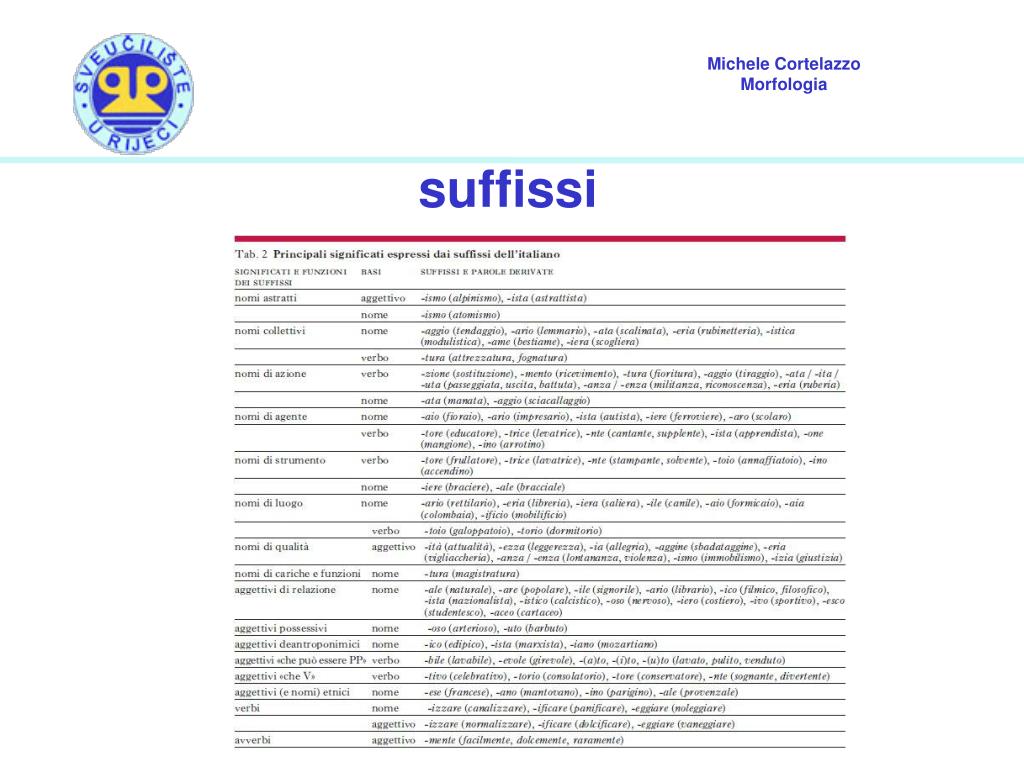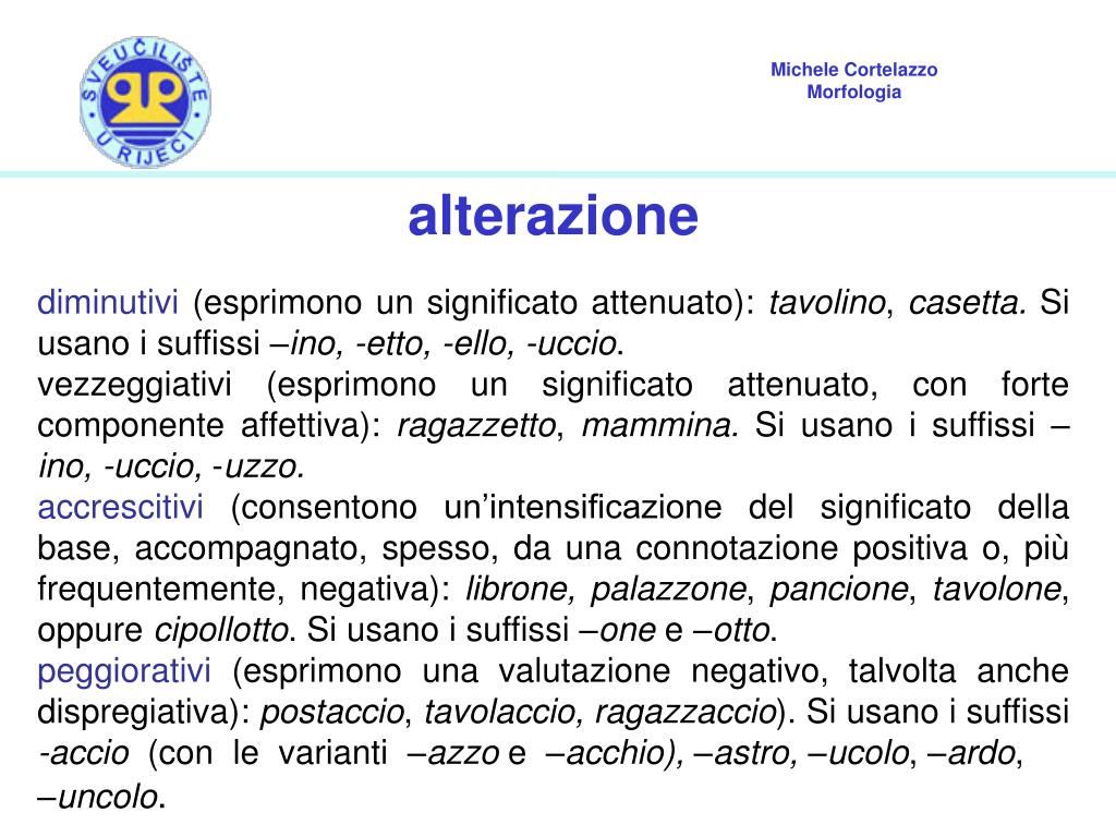alterazione diminutivi (esprimono un significato attenuato): tavolino, casetta. Si usano i suffissi –ino, -etto, -ello, -uccio. vezzeggiativi (esprimono un significato attenuato, con forte componente affettiva): ragazzetto, mammina. Si usano i suffissi –ino, -uccio, -uzzo. accrescitivi (consentono un’intensificazione del significato della base, accompagnato, spesso, da una connotazione positiva o, più frequentemente, negativa): librone, palazzone, pancione, tavolone, oppure cipollotto. Si usano i suffissi –one e –otto. peggiorativi (esprimono una valutazione negativo, talvolta anche dispregiativa): postaccio, tavolaccio, ragazzaccio). Si usano i suffissi -accio (con le varianti –azzo e –acchio), –astro, –ucolo, –ardo, –uncolo.