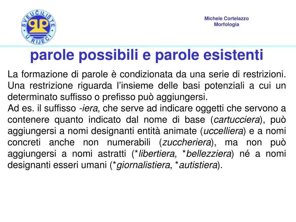 parole possibili e parole esistenti La formazione di parole è condizionata da una serie di restrizioni. Una restrizione riguarda l’insieme delle basi potenziali a cui un determinato suffisso o prefisso può aggiungersi. Ad es. il suffisso -iera, che serve ad indicare oggetti che servono a contenere quanto indicato dal nome di base (cartucciera), può aggiungersi a nomi designanti entità animate (uccelliera) e a nomi concreti anche non numerabili (zuccheriera), ma non può aggiungersi a nomi astratti (*libertiera, *bellezziera) né a nomi designanti esseri umani (*giornalistiera, *autistiera).