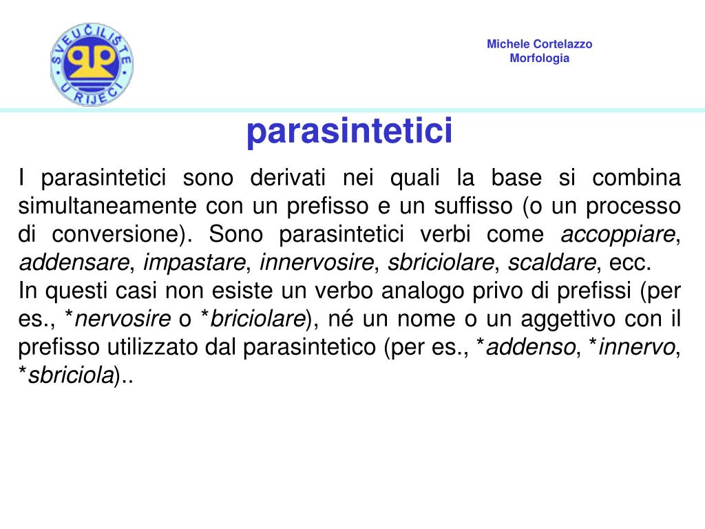 parasintetici I parasintetici sono derivati nei quali la base si combina simultaneamente con un prefisso e un suffisso (o un processo di conversione). Sono parasintetici verbi come accoppiare, addensare, impastare, innervosire, sbriciolare, scaldare, ecc. In questi casi non esiste un verbo analogo privo di prefissi (per es., *nervosire o *briciolare), né un nome o un aggettivo con il prefisso utilizzato dal parasintetico (per es., *addenso, *innervo, *sbriciola)..