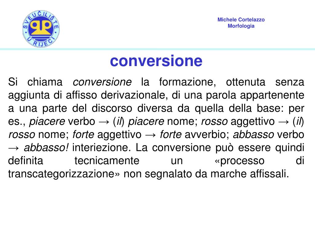 conversione Si chiama conversione la formazione, ottenuta senza aggiunta di affisso derivazionale, di una parola appartenente a una parte del discorso diversa da quella della base: per es., piacere verbo → (il) piacere nome; rosso aggettivo → (il) rosso nome; forte aggettivo → forte avverbio; abbasso verbo → abbasso! interiezione. La conversione può essere quindi definita tecnicamente un «processo di transcategorizzazione» non segnalato da marche affissali.
