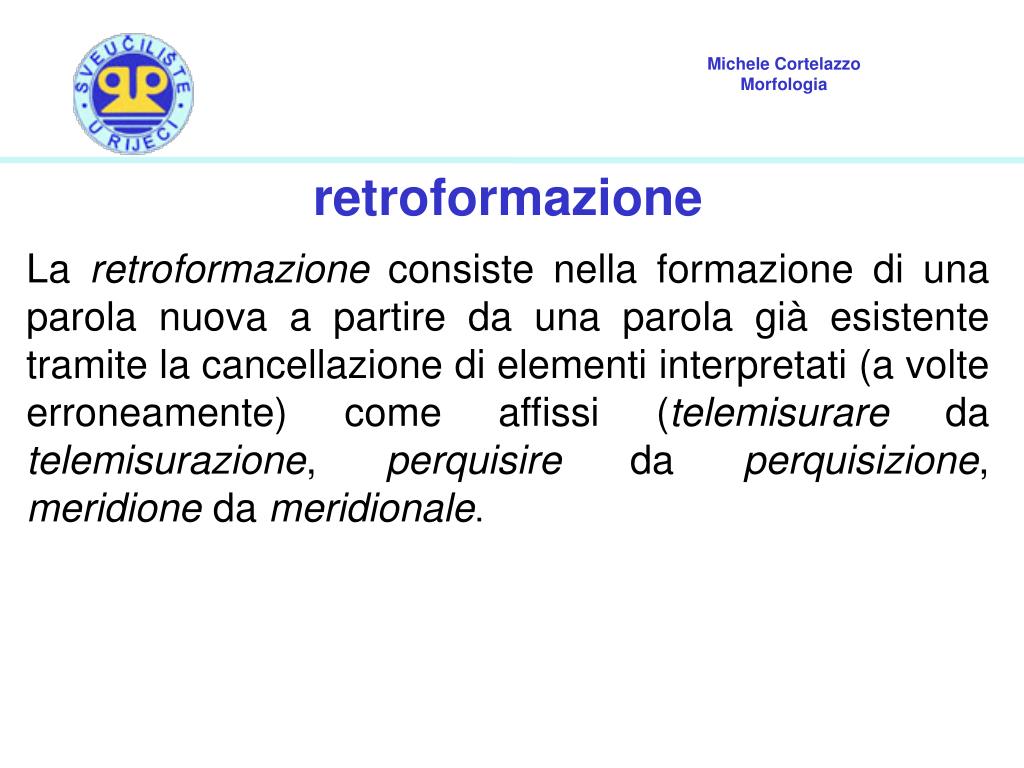 retroformazione La retroformazione consiste nella formazione di una parola nuova a partire da una parola già esistente tramite la cancellazione di elementi interpretati (a volte erroneamente) come affissi (telemisurare da telemisurazione, perquisire da perquisizione, meridione da meridionale.