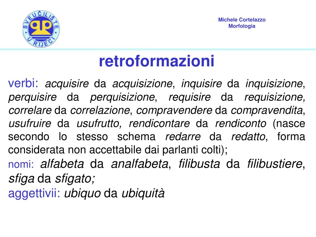 retroformazioni verbi:acquisire da acquisizione, inquisire da inquisizione, perquisire da perquisizione, requisire da requisizione, correlare da correlazione, compravendere da compravendita, usufruire da usufrutto, rendicontare da rendiconto (nasce secondo lo stesso schema redarre da redatto, forma considerata non accettabile dai parlanti colti); nomi:alfabeta da analfabeta, filibusta da filibustiere, sfiga da sfigato; aggettivii:ubiquo da ubiquità