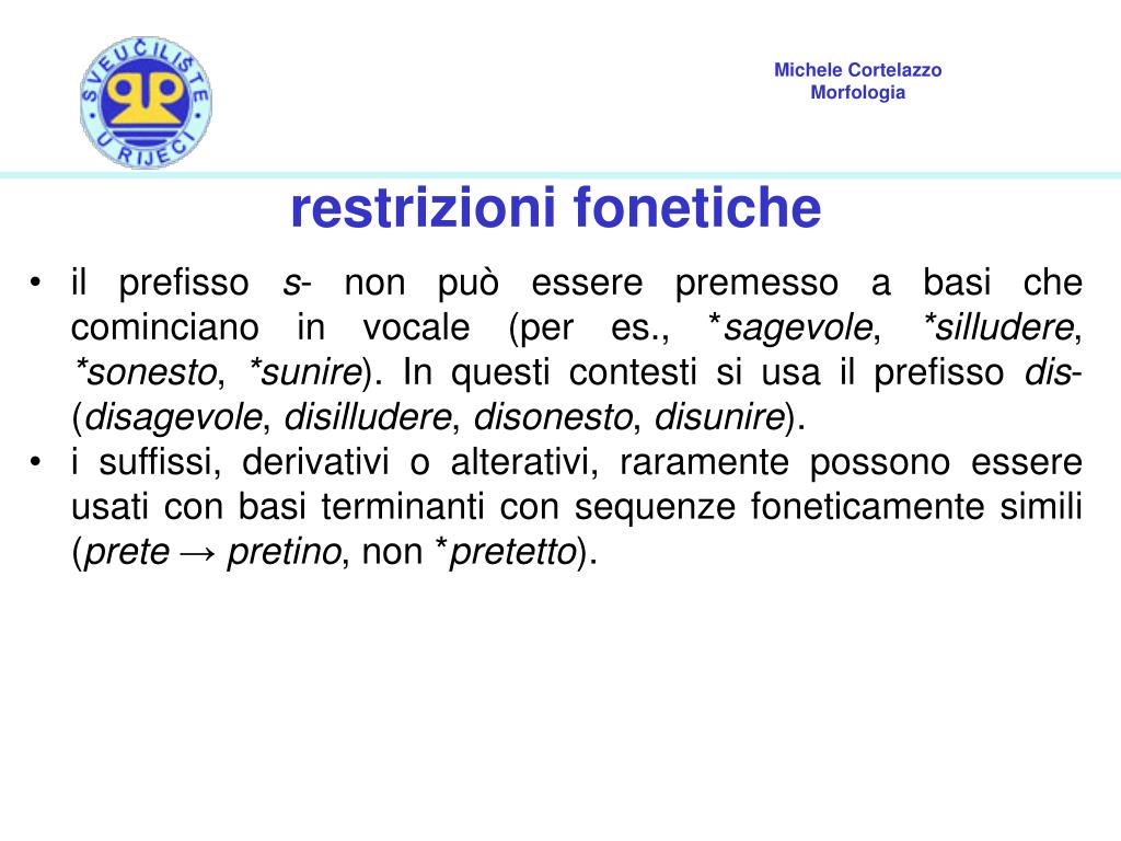 restrizioni fonetiche • il prefisso s- non può essere premesso a basi che cominciano in vocale (per es., *sagevole, *silludere, *sonesto, *sunire). In questi contesti si usa il prefisso dis- (disagevole, disilludere, disonesto, disunire). • i suffissi, derivativi o alterativi, raramente possono essere usati con basi terminanti con sequenze foneticamente simili (prete → pretino, non *pretetto).