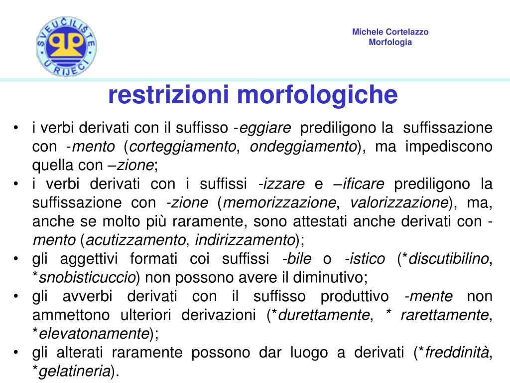restrizioni morfologiche • i verbi derivati con il suffisso -eggiare prediligono la suffissazione con -mento (corteggiamento, ondeggiamento), ma impediscono quella con –zione; • i verbi derivati con i suffissi -izzare e –ificareprediligono la suffissazione con -zione (memorizzazione, valorizzazione), ma, anche se molto più raramente, sono attestati anche derivati con -mento (acutizzamento, indirizzamento); • gli aggettivi formati coi suffissi -bile o -istico (*discutibilino, *snobisticuccio) non possono avere il diminutivo; • gli avverbi derivati con il suffisso produttivo -mente non ammettono ulteriori derivazioni (*durettamente, * rarettamente, *elevatonamente); • gli alterati raramente possono dar luogo a derivati (*freddinità, *gelatineria).