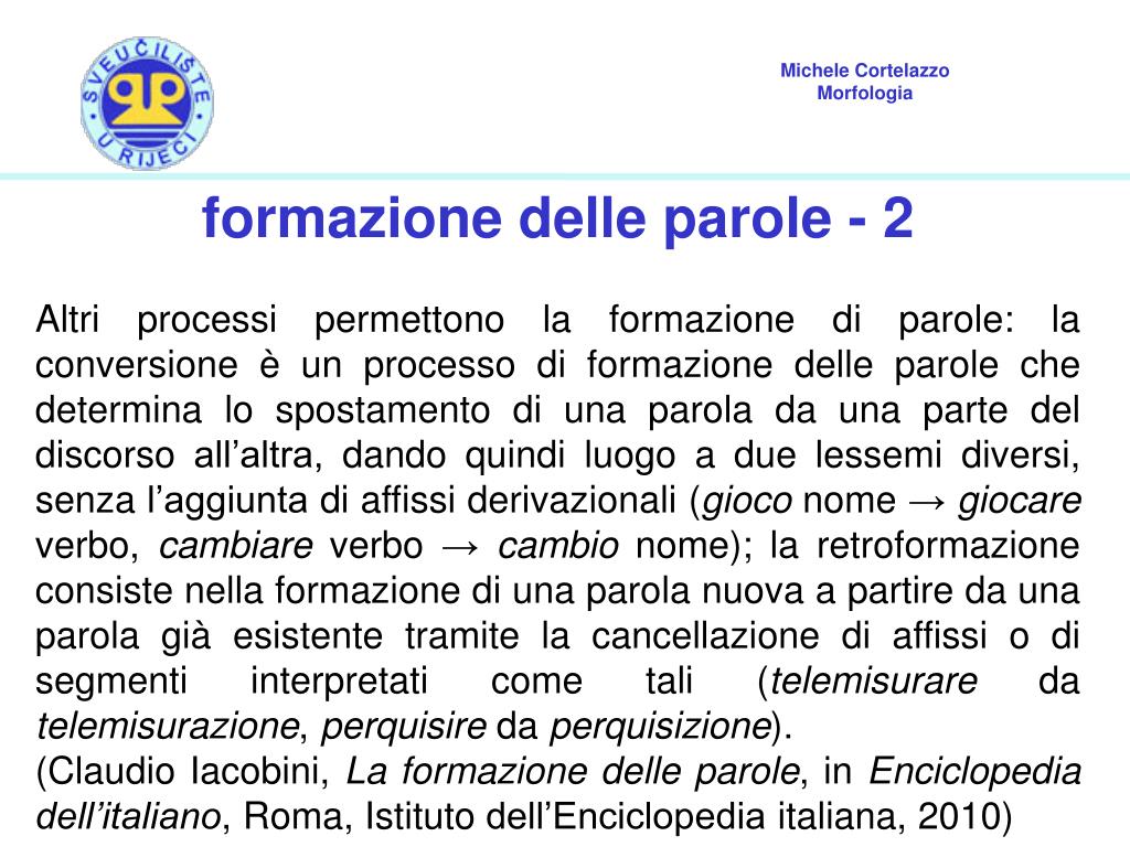 formazione delle parole - 2 Altri processi permettono la formazione di parole: la conversione è un processo di formazione delle parole che determina lo spostamento di una parola da una parte del discorso all’altra, dando quindi luogo a due lessemi diversi, senza l’aggiunta di affissi derivazionali (gioco nome → giocare verbo, cambiare verbo → cambio nome); la retroformazione consiste nella formazione di una parola nuova a partire da una parola già esistente tramite la cancellazione di affissi o di segmenti interpretati come tali (telemisurare da telemisurazione, perquisire da perquisizione). (Claudio Iacobini, La formazione delle parole, in Enciclopedia dell’italiano, Roma, Istituto dell’Enciclopedia italiana, 2010)