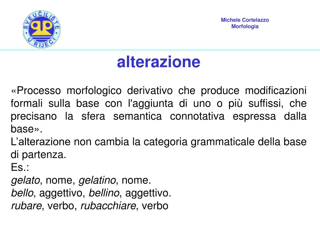alterazione «Processo morfologico derivativo che produce modificazioni formali sulla base con l'aggiunta di uno o più suffissi, che precisano la sfera semantica connotativa espressa dalla base». L’alterazione non cambia la categoria grammaticale della base di partenza. Es.: gelato, nome, gelatino, nome. bello, aggettivo, bellino, aggettivo. rubare, verbo, rubacchiare, verbo