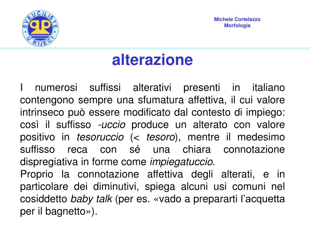 alterazione I numerosi suffissi alterativi presenti in italiano contengono sempre una sfumatura affettiva, il cui valore intrinseco può essere modificato dal contesto di impiego: così il suffisso -uccio produce un alterato con valore positivo in tesoruccio (< tesoro), mentre il medesimo suffisso reca con sé una chiara connotazione dispregiativa in forme come impiegatuccio. Proprio la connotazione affettiva degli alterati, e in particolare dei diminutivi, spiega alcuni usi comuni nel cosiddetto baby talk (per es. «vado a prepararti l’acquetta per il bagnetto»).