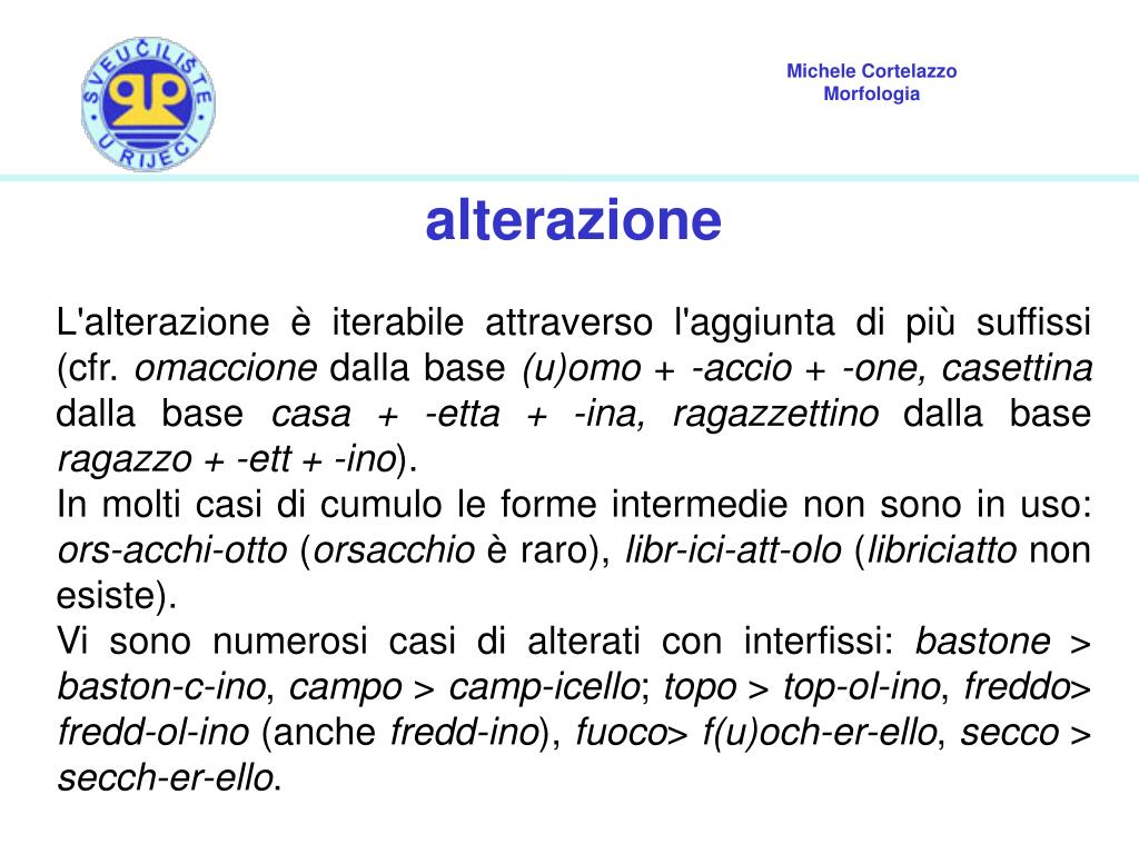 alterazione L'alterazione è iterabile attraverso l'aggiunta di più suffissi (cfr. omaccione dalla base (u)omo + -accio + -one, casettina dalla base casa + -etta + -ina, ragazzettino dalla base ragazzo + -ett + -ino). In molti casi di cumulo le forme intermedie non sono in uso: ors-acchi-otto (orsacchio è raro), libr-ici-att-olo (libriciatto non esiste). Vi sono numerosi casi di alterati con interfissi: bastone > baston-c-ino, campo > camp-icello; topo > top-ol-ino, freddo> fredd-ol-ino (anche fredd-ino), fuoco> f(u)och-er-ello, secco > secch-er-ello.