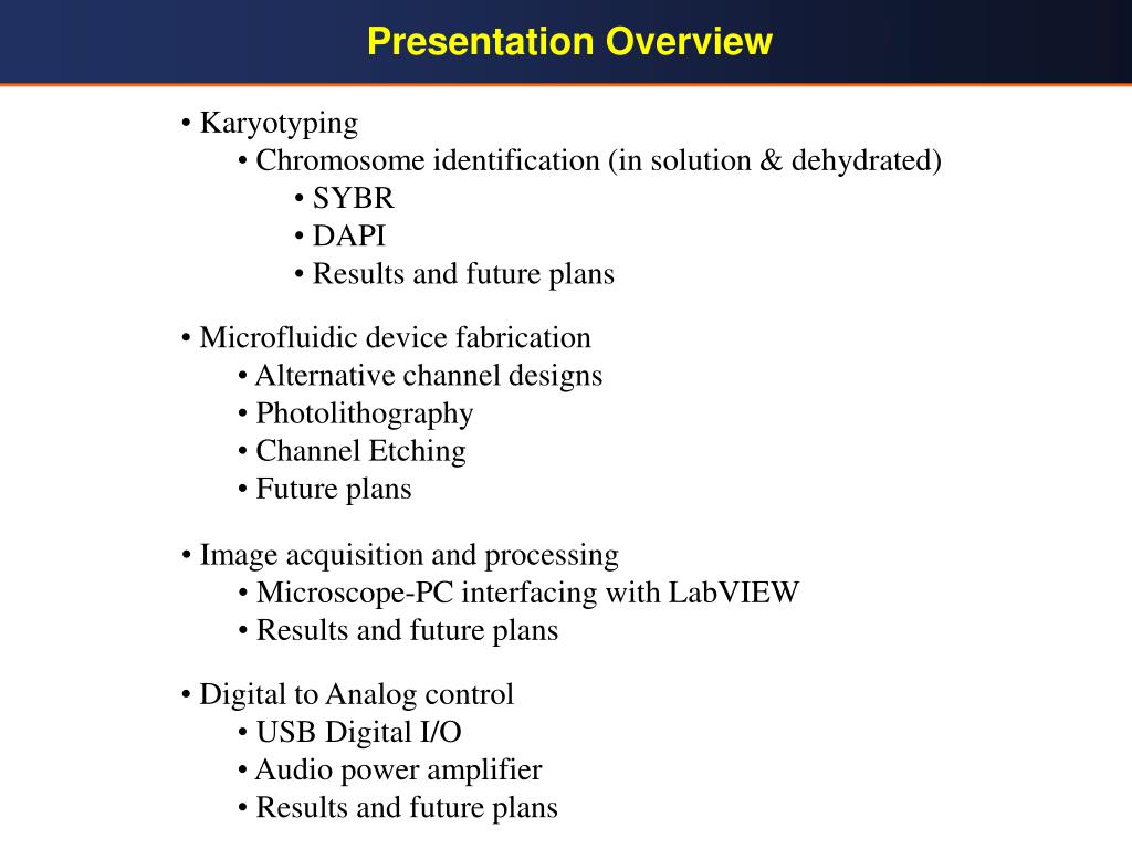 Presentation Overview • Karyotyping • Chromosome identification (in solution & dehydrated) • SYBR • DAPI • Results and future plans • Microfluidic device fabrication • Alternative channel designs • Photolithography • Channel Etching • Future plans • Image acquisition and processing • Microscope-PC interfacing with LabVIEW • Results and future plans • Digital to Analog control • USB Digital I/O • Audio power amplifier • Results and future plans
