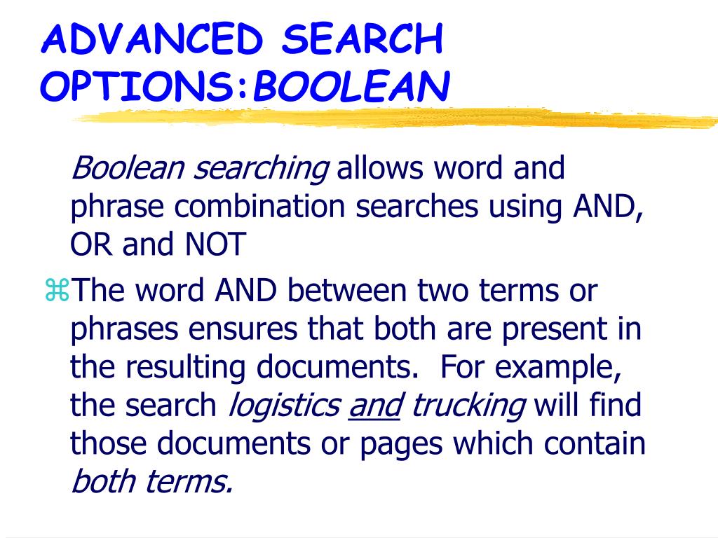 ADVANCED SEARCH OPTIONS:BOOLEAN Boolean searching allows word and phrase combination searches using AND, OR and NOT • The word AND between two terms or phrases ensures that both are present in the resulting documents. For example, the search logistics and trucking will find those documents or pages which contain both terms.