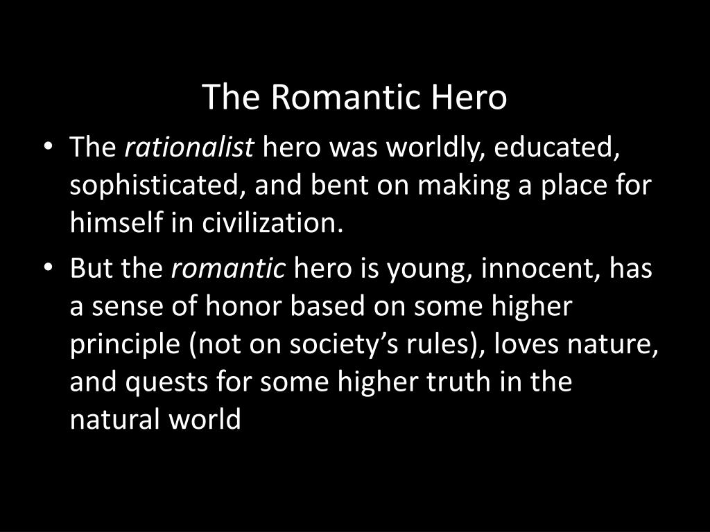 The Romantic Hero • The rationalist hero was worldly, educated, sophisticated, and bent on making a place for himself in civilization. • But the romantic hero is young, innocent, has a sense of honor based on some higher principle (not on society’s rules), loves nature, and quests for some higher truth in the natural world