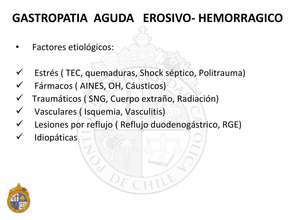 Factores etiológicos: Estrés ( TEC, quemaduras, Shock séptico, Politrauma) Fármacos ( AINES, OH, Cáusticos) Traumáticos ( SNG, Cuerpo extraño, Radiación) Vasculares ( Isquemia, Vasculitis) Lesiones por reflujo ( Reflujo duodenogástrico, RGE) Idiopáticas GASTROPATIA AGUDA EROSIVO- HEMORRAGICO