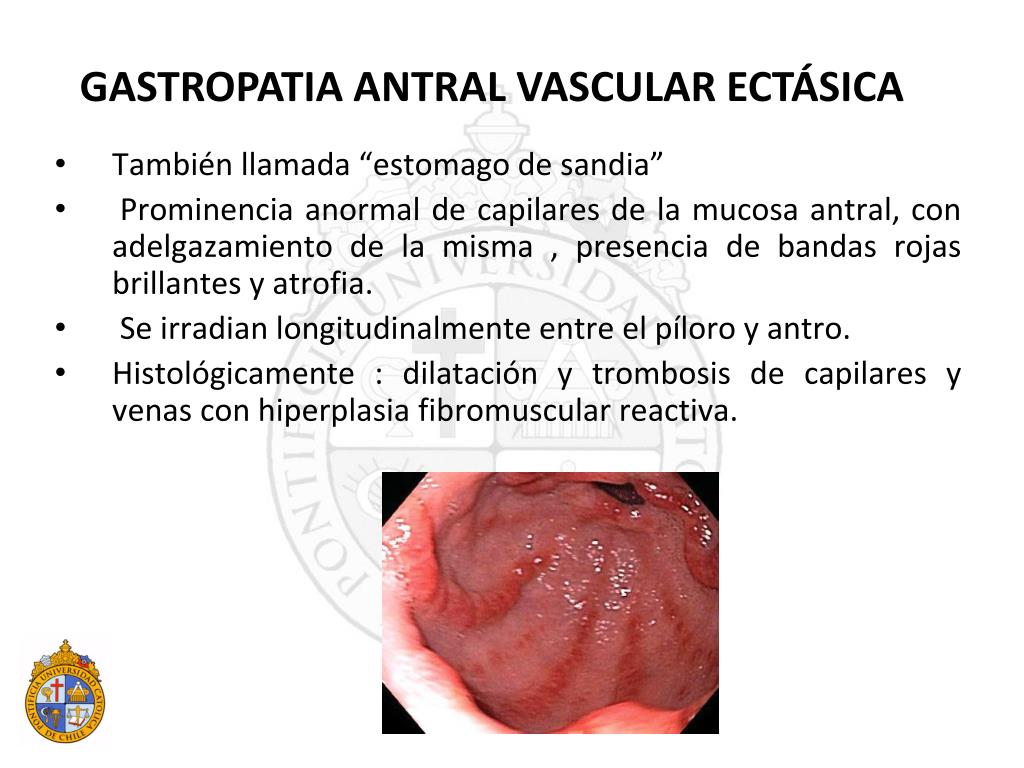 También llamada “estomago de sandia” Prominencia anormal de capilares de la mucosa antral, con adelgazamiento de la misma , presencia de bandas rojas brillantes y atrofia. Se irradian longitudinalmente entre el píloro y antro. Histológicamente : dilatación y trombosis de capilares y venas con hiperplasia fibromuscular reactiva. GASTROPATIA ANTRAL VASCULAR ECTÁSICA